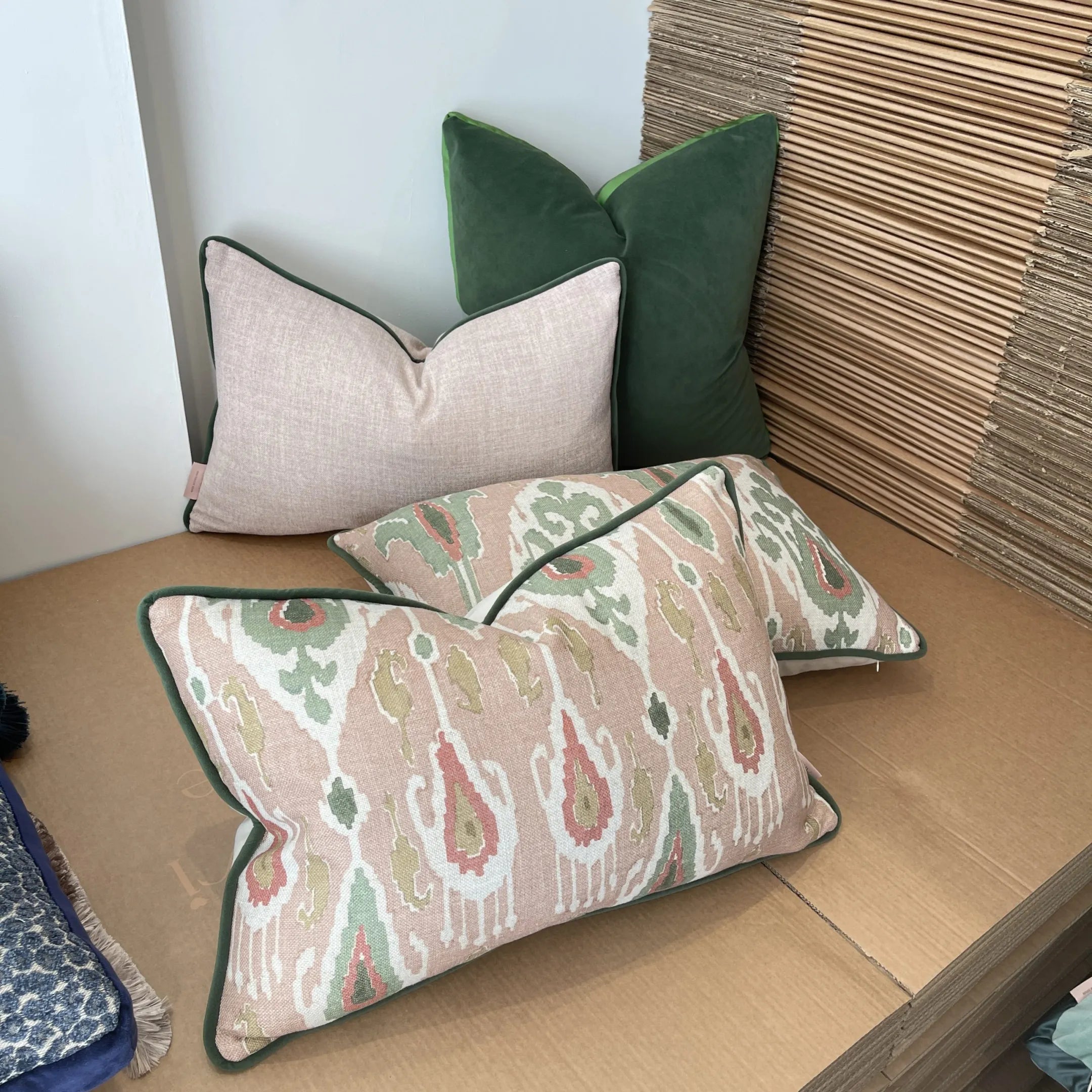 It all begins with the design, in which we put together fabric swatches from our favourite designers that we love and compliment each other. All of our cushions are then lovingly made by hand in Hertfordshire, using the best techniques such as overlock stitching to ensure quality and durability.